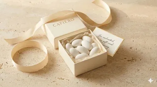 A timeless wedding favor, handcrafted in the Sicilian tradition. Five sugar-coated Mandorla di Avola almonds presented in an elegant ivory keepsake box—a graceful gesture of sweetness and good fortune for every guest at your table.
